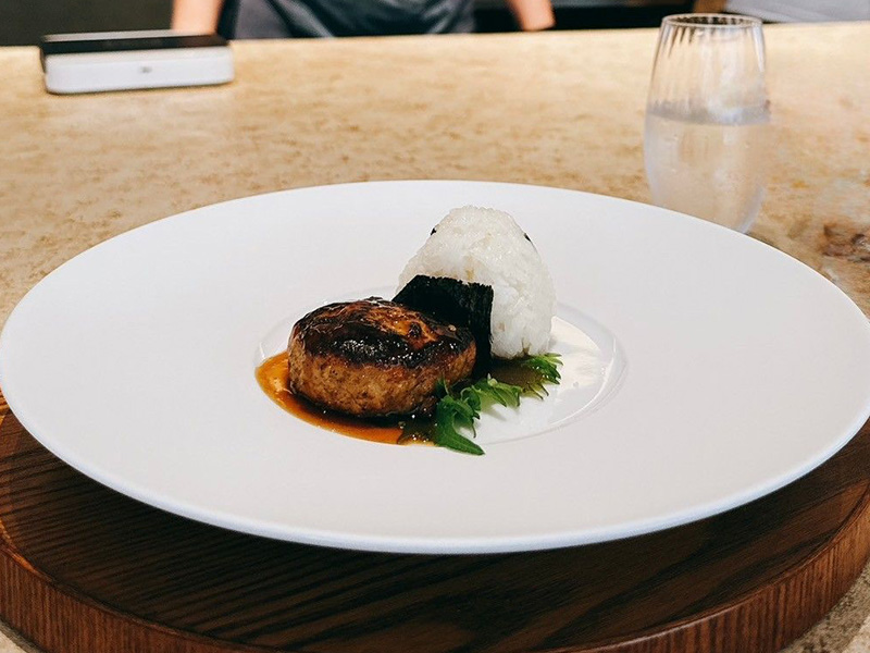 接著是莎莎久違日夜手打的漢堡排,特別加入雞爪增加Q彈口感、以及甘藍粉的甘甜,讓整體有著細膩的清爽感,搭配現捏白米與糯米混合的飯糰,一口柑橘肉汁、黏糯的米芯,還有微酸辛的紫蘇葉
