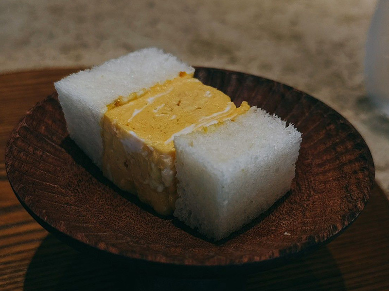 而一旁的大熊師傅與莎莎肩靠肩的一起將烏魚子奶油抹在柔軟的牛奶吐司,再將現煎的玉子燒夾在裡頭、輕扶吐司表層,一刀一刀地劃開,三明治的質地完整保留到入口那刻,融、於、此、地,是個連男子漢都會屈服的細膩柔軟,配上咖啡花葉茶,真心喜歡!