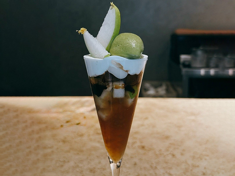 舉起高腳杯,裡頭注入茉莉綠茶凍、黑糖涼糕、蜜棗丁,最上頭在擺上蜜棗片與抹茶冰淇淋,一抹清新絕對是形容在此刻,而SOER的專屬咖啡師端上一杯espresso ,說:「這時候一口乾了!最爽快!」