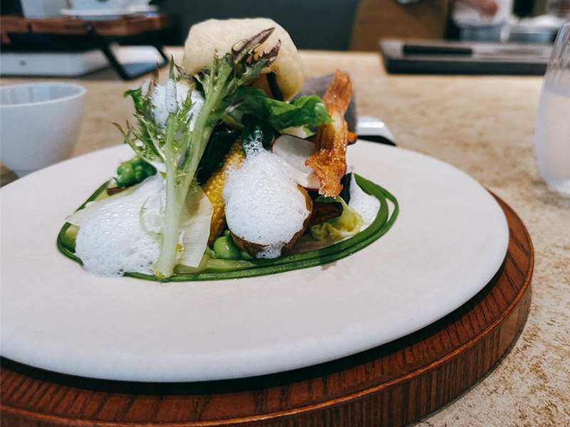 入座後,迎來第一杯藝妓咖啡葉茶,配上主廚們網羅24樣食材組合用咖啡豆漿sauce鋪底的蔬菜沙拉,是被鳥鳴喚醒的舒心早晨滋味!
