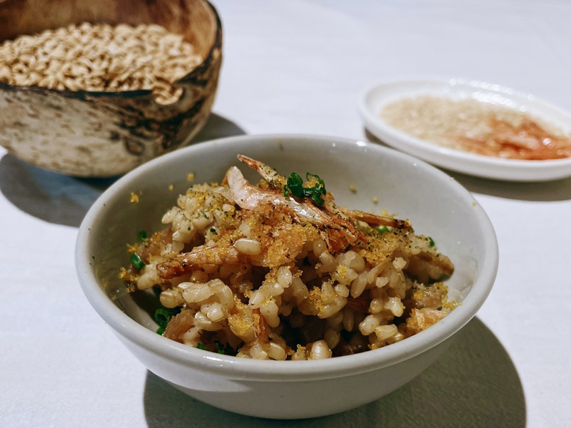 海鮮高湯烹煮包心菜飯,細細刨上烏魚子;