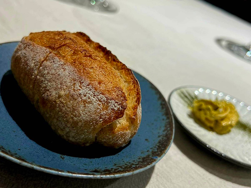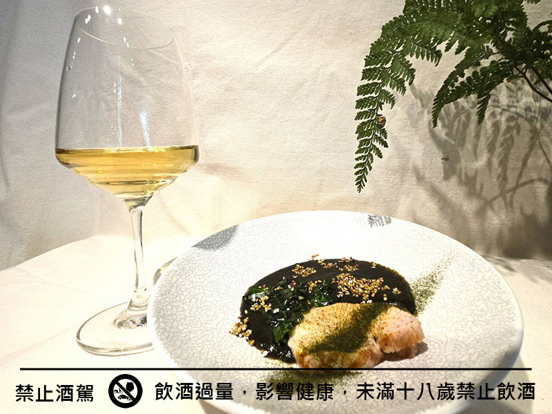 油脂豐厚的青甘,搭配著一張張用手烤海苔與赤嘴高湯熬煮的海苔醬,潮間帶上的鮮味與細緻粉嫩的黑皮諾白酒協調的融合,形成獨特的鮮旨味。