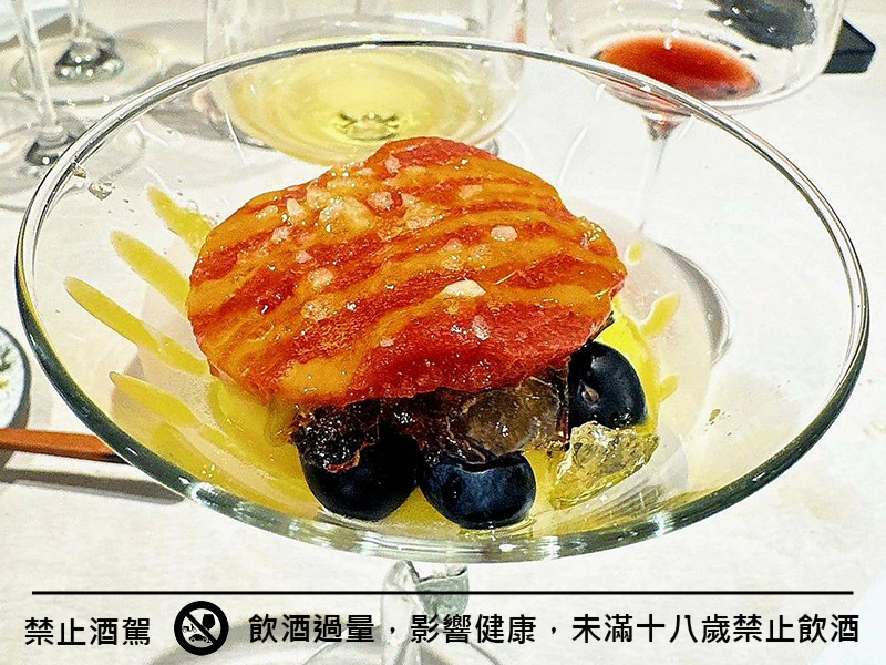 主廚的自製墨魚醬,隱藏著金嵐蝦純淨的香氣,新鮮的彩紅蕃茄,與金黃的橘酒結合,橙花香氣綻放,柔化橙子的酸,留下甜美圓潤的柑橘尾韻。