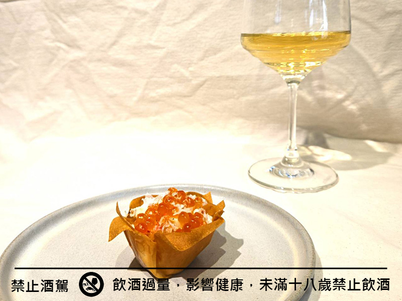 此組合是當晚客人的心頭好。Mona的搭餐準則,喜歡將酒與料理圓融的鑲嵌在一起,不只是疊加或互補。淺稻草黃,清新的青蘋果、柑橘果香濃郁、酸度鮮明,輕巧的與蟹肉、香檸、花枝、青蘋果共舞,唯美又浪漫的組合。