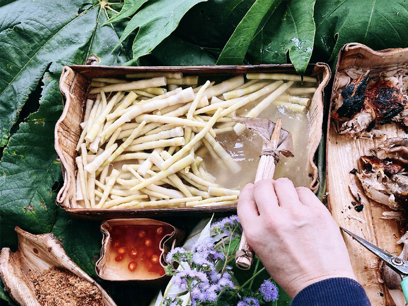 MAMA 夫妻將箭筍煮成湯,搭配阿美族的生豬肉siraw、蕗蕎、小米辣椒,装進天然容器香蕉碗,每個人都格外珍惜手上那一碗的香甜,咕嚕咕嚕的滿足著喝著。