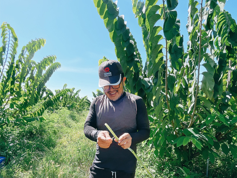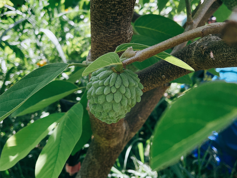 在俊儀哥的農田裡,看到顆顆結果的小釋迦,每一顆都在如父母般的大大釋迦葉陰蔭中安穩長大。